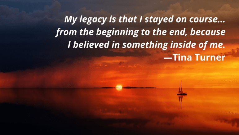 Quote: My legacy is that I stayed on course… from the beginning to the end, because I believed in something inside of me.—Tina Turner